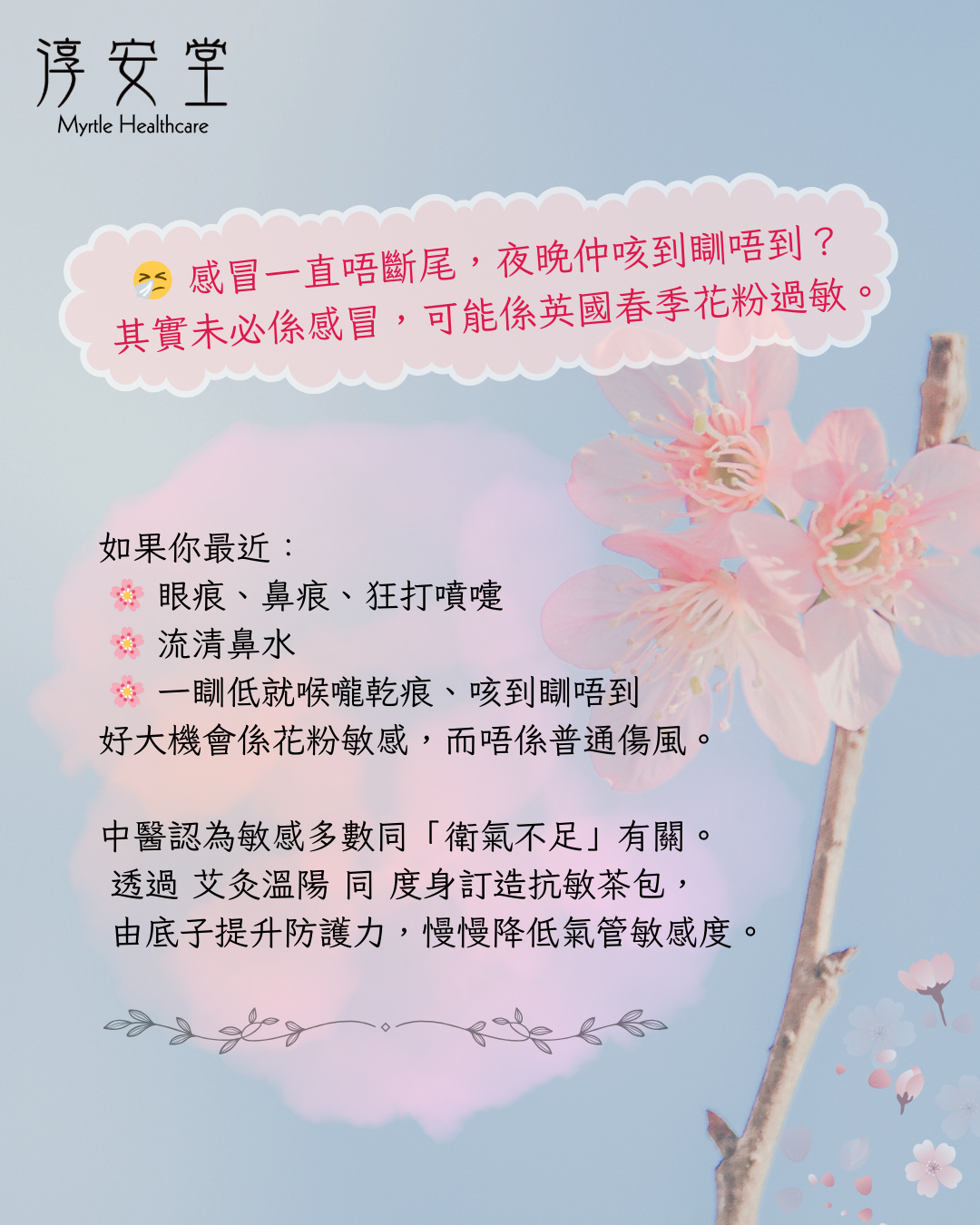踏入三月,英國開始回暖,周圍嘅花草樹木都開始復甦。最近好多客人都 Inbox 話係咁打噴嚏、眼水長流,最慘係夜晚喉嚨好似有條羽毛掃下掃下,咳到瞓唔到!😮‍💨