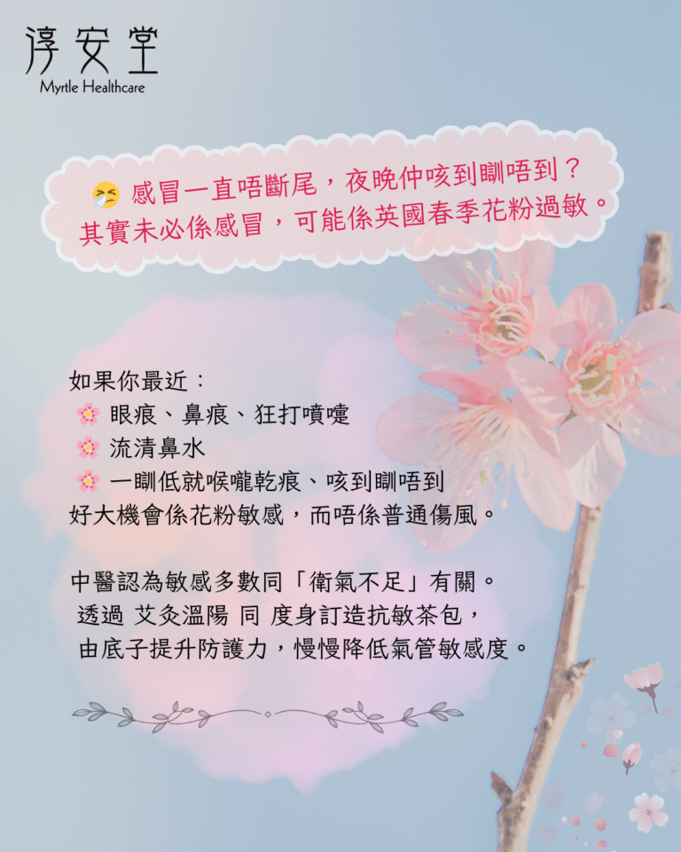 中醫調理12 3 月, 2026感冒一直唔斷尾,夜晚仲要「咳到瞓唔到」?🤧 其實可能係英國春季花粉過敏殺到!踏入三月,英國開始回暖,周圍嘅花草樹木… Read More感冒一直唔斷尾,夜晚仲要「咳到瞓唔到」?🤧 其實可能係英國春季花粉過敏殺到!
